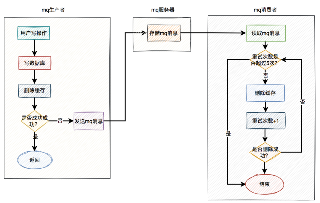 - 当用户操作写完数据库,但删除缓存失败了,产生一条mq消息,发送给mq服务器。